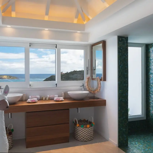 Salle de bain de luxe villa a Saint Barthelemy Caraibes, Lorenz Bali sourcing fabricant production sur mesure design.