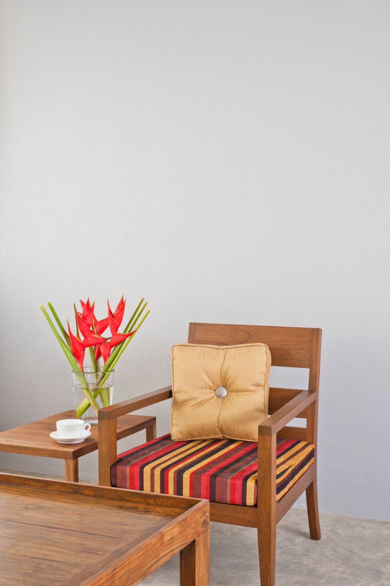 Stylish composition of creative and cozy living room interior details with rattan armchair and dried plants in grey vase. Eucalyptus walls.
