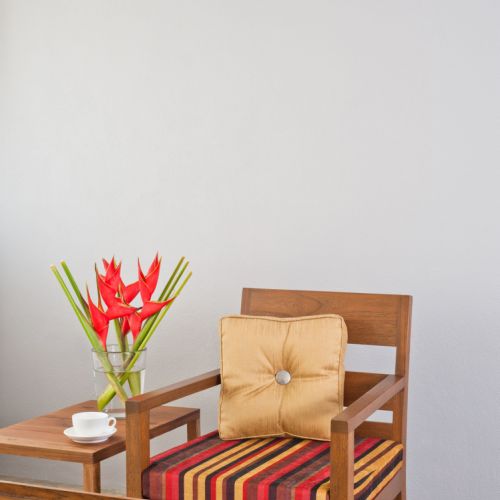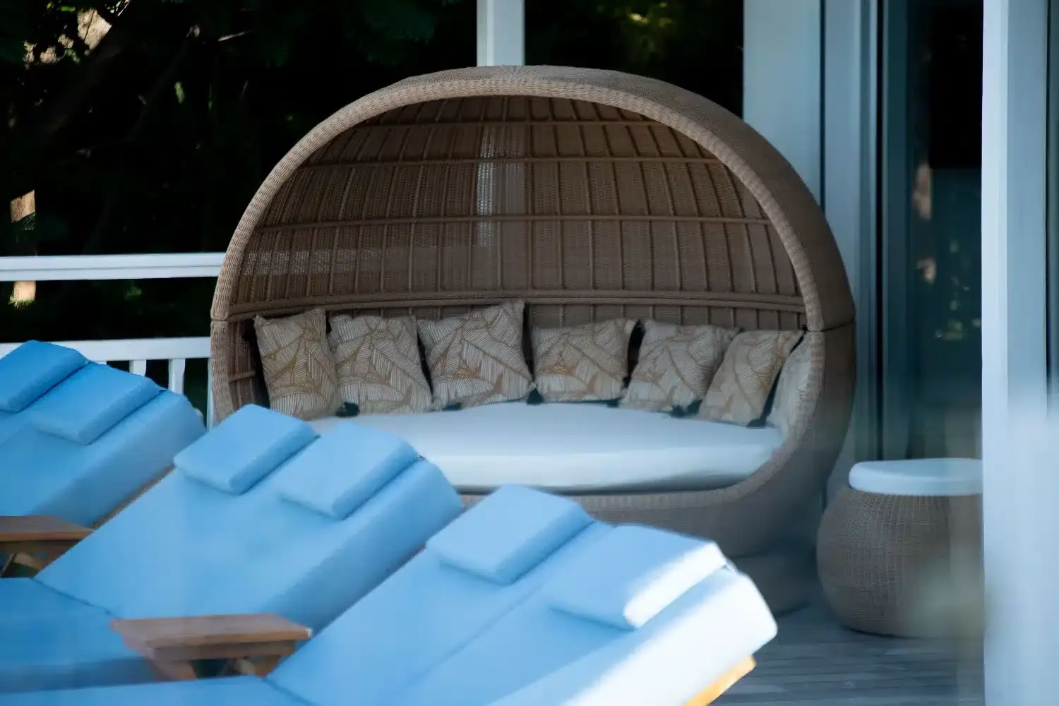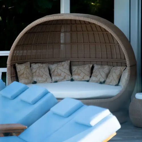Decoration haut de gamme terrasse en rotin synthetique, statue en resine, table en bois. Lorenz Bali sourcing fabricant production design sur mesure.
