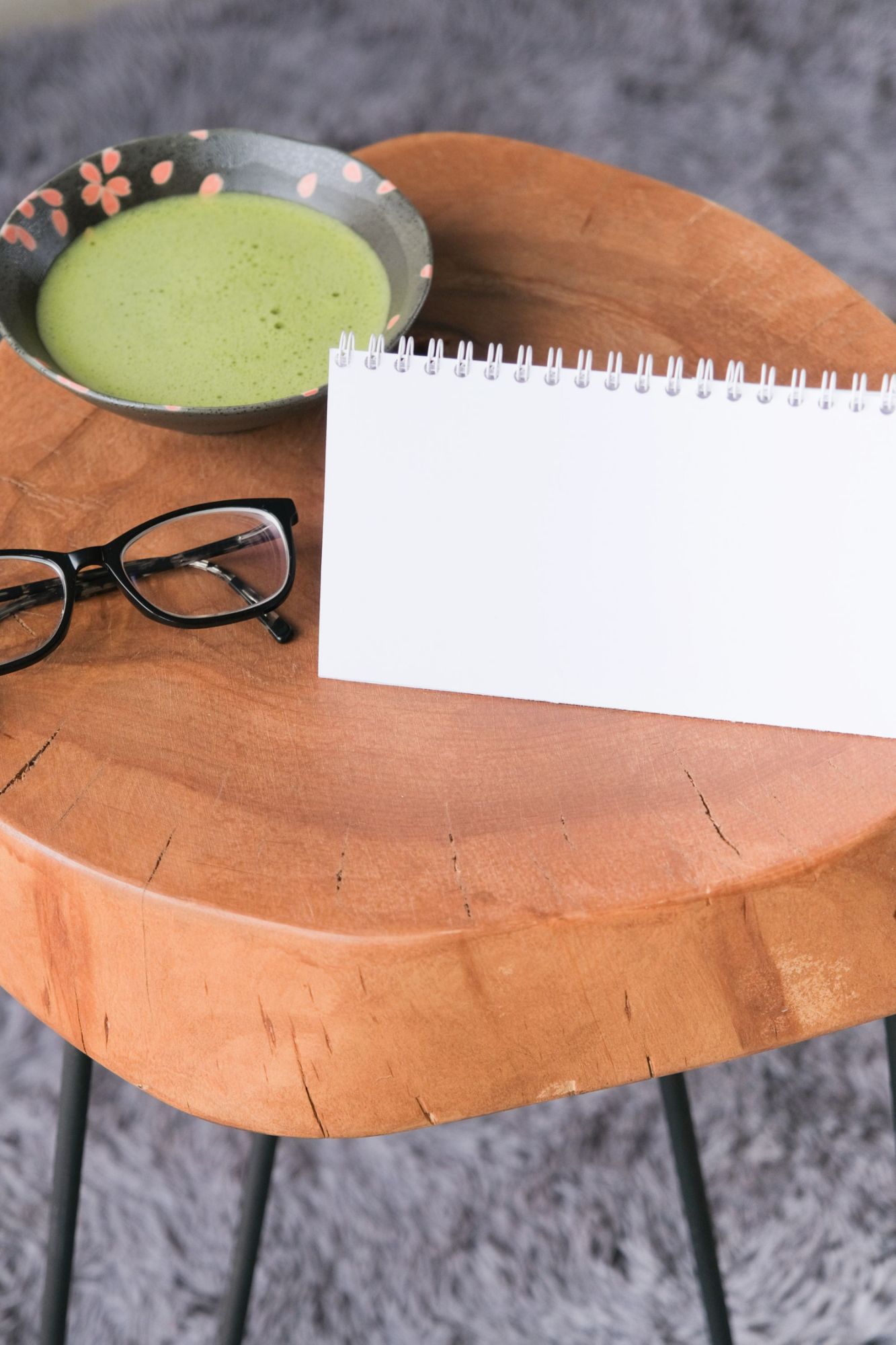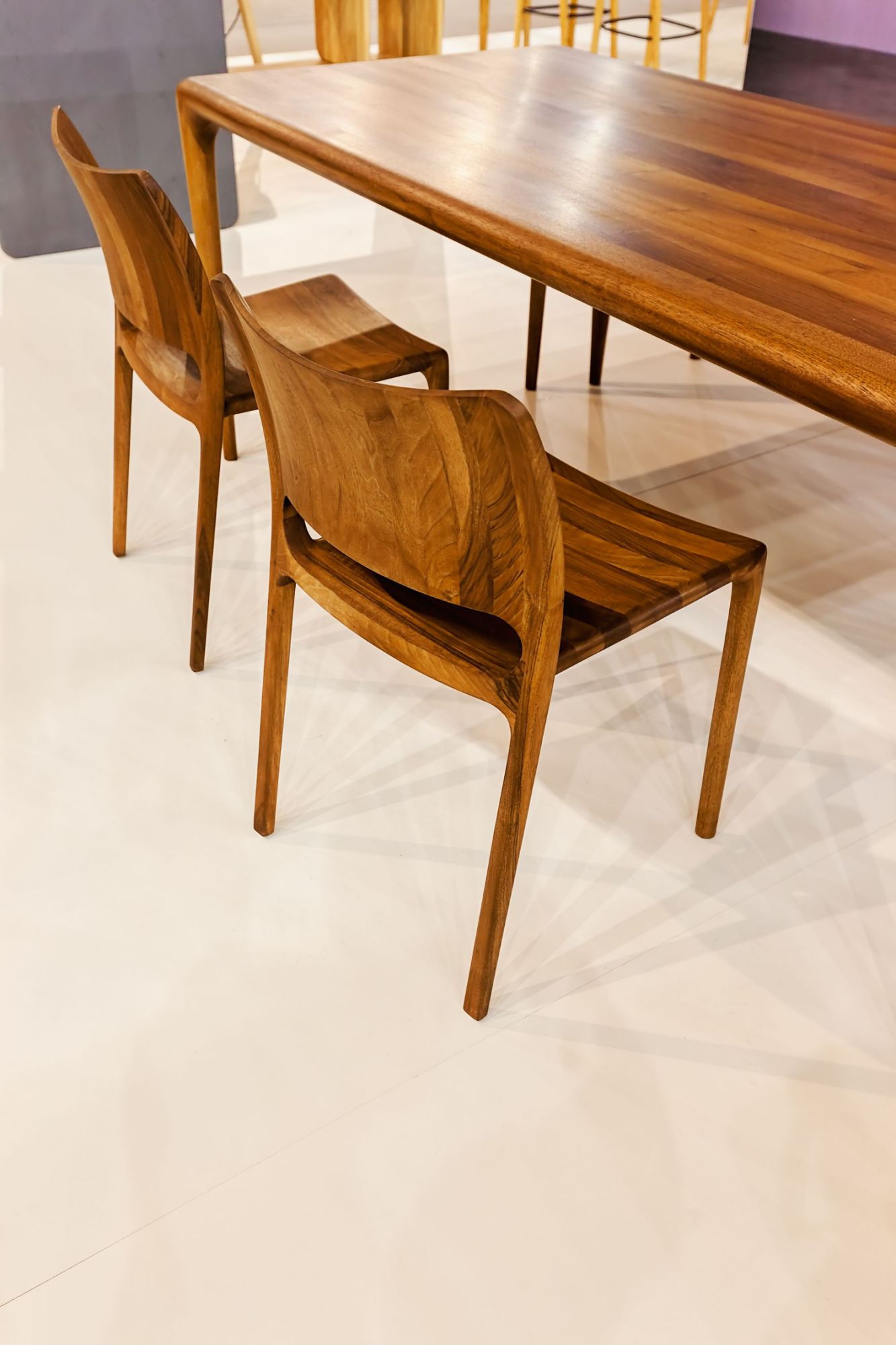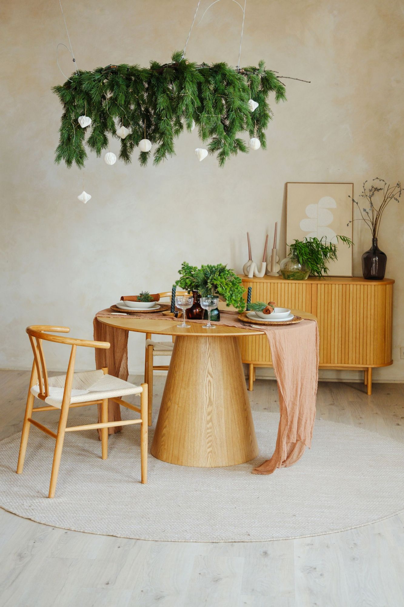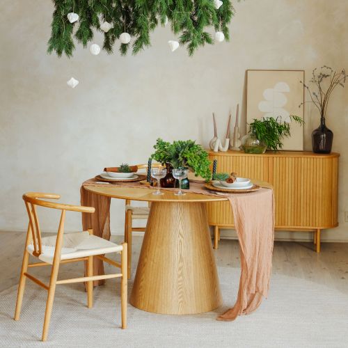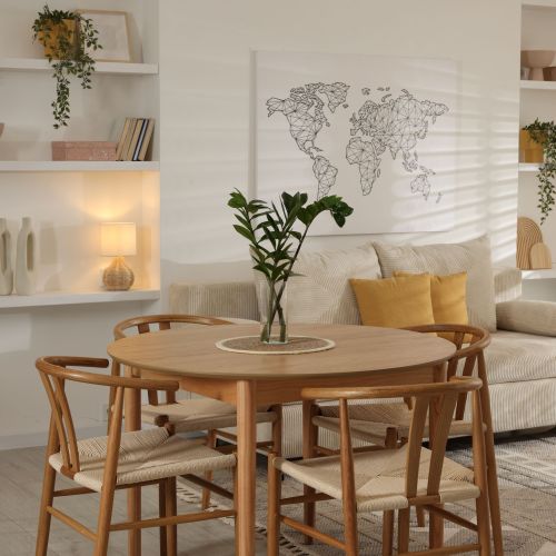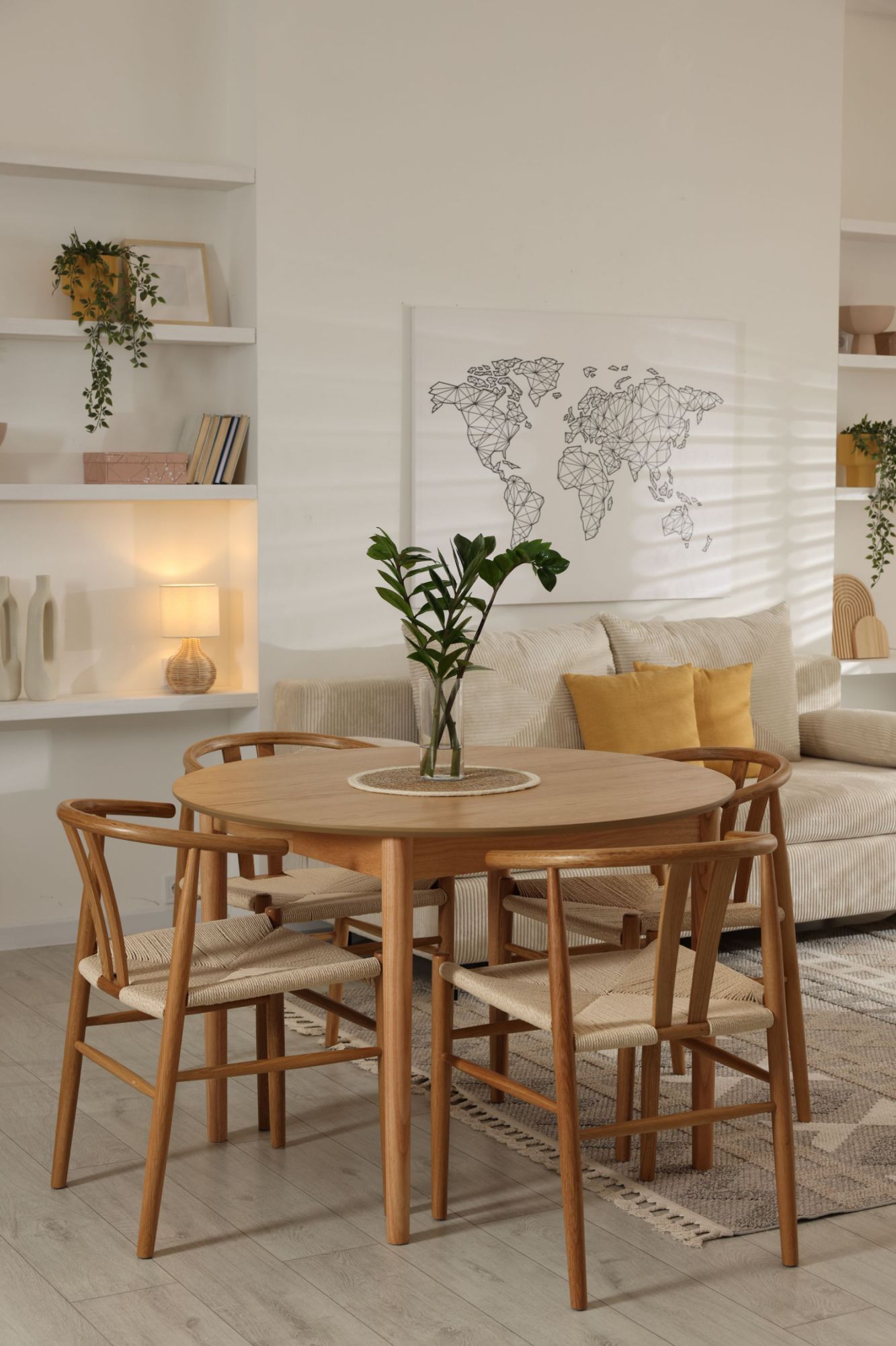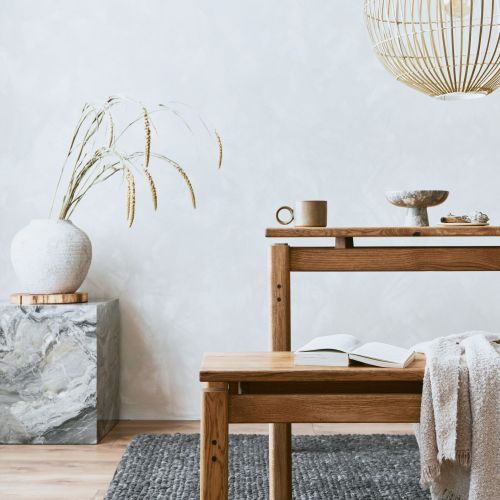 Elegant dining room interior composition with wooden dining table, bench and design home decorations and personal accessories. Modern home staging. Wabi sabi inspiration. Template.
