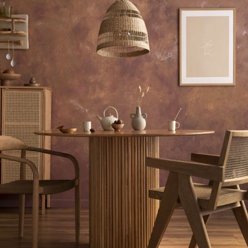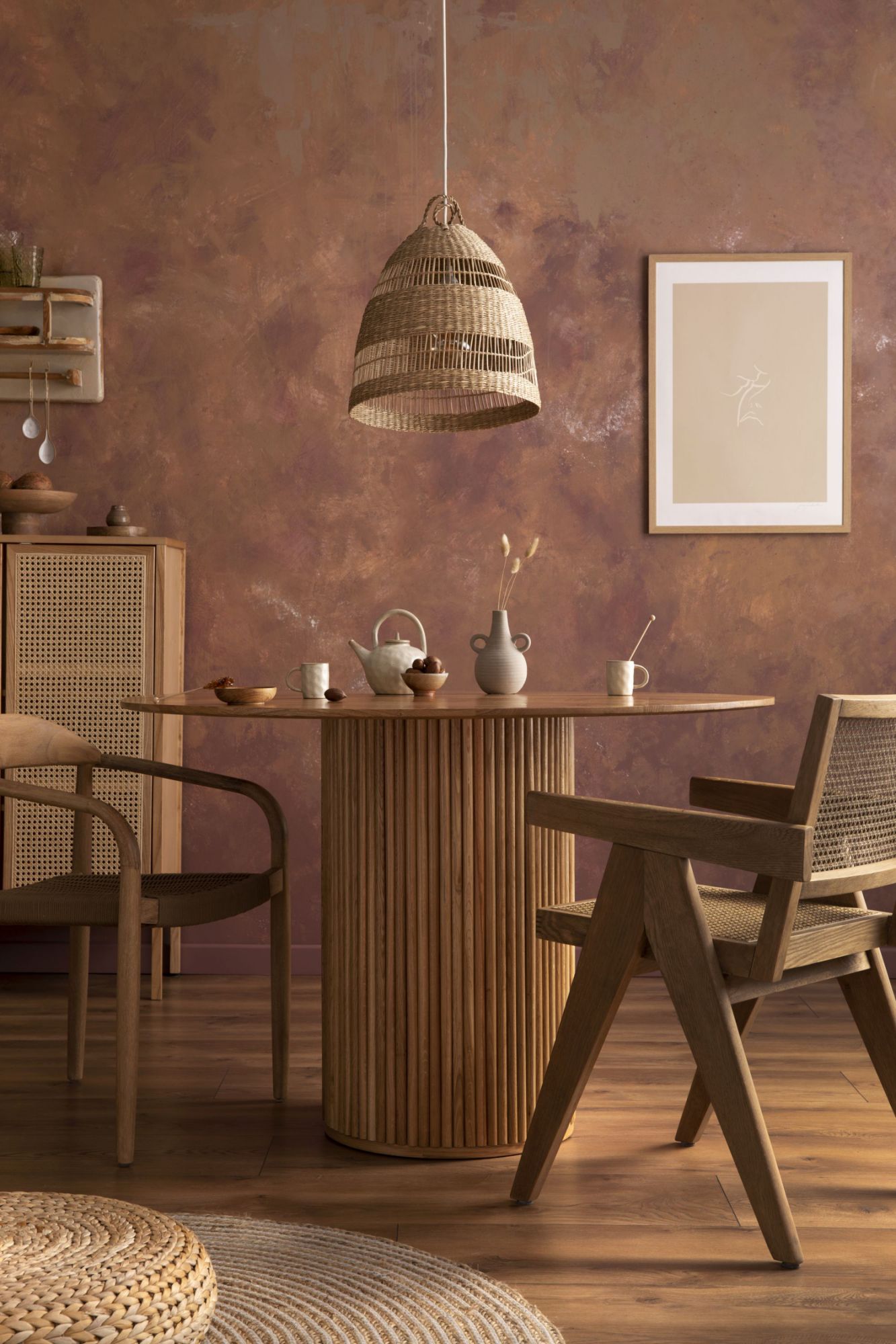 Stylish boho vintage dining room interior with poster mock up. Round table with rattan armchair, round carpet with pouf, vase with dried flowers and cup. Brown wall and rattan lamp. Mock up poster. Template.