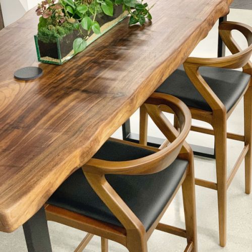 A set of wooden table and armchairs under ceiling lamp in a dining room or cafe with odd shaped window. Shop Interior, 3D Rendering, 3D Illustration.